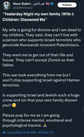 دا چي پر دې محدود پلېټ فارم ئې د خپرلو اجازه نسته نو مجبوراً ئې نه خپروم؛ په هر صورت یوه بله غوره خبره دا ده چي دا سړی وايي: د ازرائیـ.ـ.ـ.ل د ملاتړ او حمـ.ـ.ـاس د مخالفت په سبب مي مېرمن غواړي طلاق راڅخه واخلي؛ زه مي د بچیانو لپاره نور مړ یم؛ خو زه به بیا هم د حق (اصلاً له باطل څخه) څخه ملاتړ کوم.
