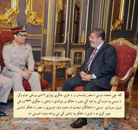 کله چي محمد مرسي د مصر ولسمشر و، د مقدسي زمکي جگړي یوازي ۶-شپږ ورځي دوام وکړ. د سیسي په دوره کي په همدې کلابنده سیمه کي زموږ د خلکو پر وړاندي د تباهۍ د جگړي ۴۳۳-ورځي تیري سويدي. سیسي د اشغـ-ـالگرو اېجنټ او مجرم دئ؛ نوموړي د مصر د خلکو شتمنۍ چور کړي او د غـ-ـ.-ـزې د خلکو په تباهۍ کې ئې پراخه ونډه اخیستې ده.