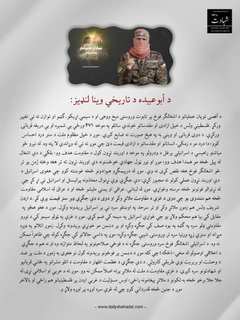 د أقصٰی توپان عملیاتو د اشغالگر فوځ پر تابوت وروستی مېخ ووهی د أقصٰی توپان عملیاتو د اشغالگر فوځ پر تابوت وروستی مېخ ووهی او د سیمي اړيکو، گټـو او توازن ته ئې تغییر ورکړ. فلسطیني ولس د خپل ازادۍ او مقدساتو خوندي ساتلو په موخه ۴۷۱-ورځي بې شمېره او بې درېغه قربانۍ ورکړې. د دوی قربانۍ او ویني به په هیڅ صورت نه ضایع کېږي. موږ د خپل مظلوم ملت د ستر درد احساس کوو؛ دا درد مو د زمکي، انسانانو او مقدساتو د ازادۍ قیمت دئ چي موږ ته ئې له وړاندي لا پته وه. له تېرو څو میاشتو راهېسي د اسرائیلي یرغل د ودرولو په موخه د اوربند تړون کول د مقاومت هدف وو؛ بلکي د دې اشغال له پیل څخه مو همدا هدف وو؛ موږ او نور ټول جهادي خوځښتونه دې اوربند تړون ته تر هغه وخته ژمن یو تر څو اشغالگر فوځ هغه نقض کړی نه وي. موږ له درېیمگړو هېوادونو څخه غوښتنه کوو چ...