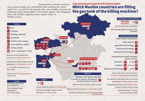 د حوثیانو د بریدونو په پایله کي چي په سره سمندرگي Red Sea کي د هغوی تجارتي لاري وتړل سوې؛ نو ټول مهم توکي ئې د عرب اماراتو له لاري سعودي عرب او ورپسې د اردن له لاري ملعون قوم ته ورسول کېږي. همداسي د اذربائیجان او قزاقستان تېل د ترکیې له لاري همدې ملعون قوم ته ورسول کېږي. بحرین هم په دې غدر کي شامل دئ؛ د مراکش خو عملاً پوځیان د هغوی په لیکو کي جنگېږي... دا اسلامي نړۍ ده...