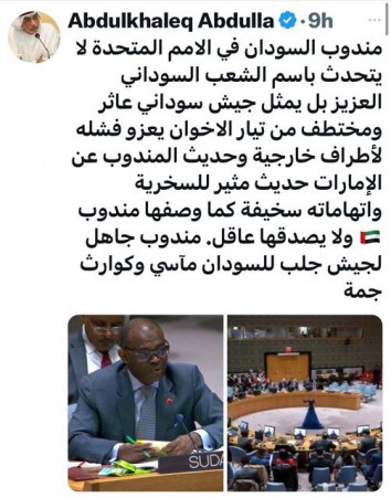 "په ملگرو ملتونو کي د سوډان استازی د سوډان د گرانو خلکو په استازیتوب خبري نه کوي؛ بلکي د اخوان المسلمین لخوا د یرغمال سوي سوډاني پوځ استازیتوب کوي. د اماراتو په اړه د دې استازي خبري مسخره او تورونه دي لکه څنگه چي د سوډاني پوځ استازي بیان کړيدي. هیڅ معقول سړی به په دوی باور ونه کړي. دا د پوځ یو ځواکمن استازی و چي سوډان ته ئې لویه غمیزه او آفتونه راوړل."