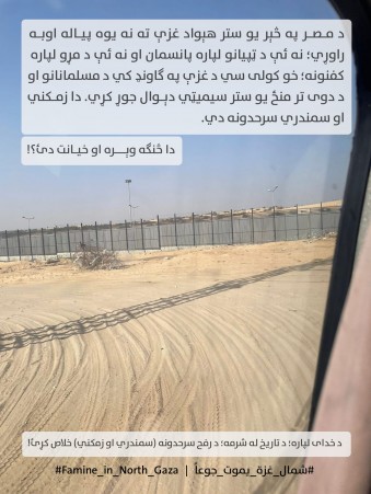 د دیکتاتور عبدالفتاح السیسي د مصر صفري سرحدي نقطه؛ له مقدسي زمکي سره د دوی هغه سرحد چي دوی ستر ستر سمینټي دېوالونه ورسره جوړ کړيدي؛ همغه صفري نقطه چي خبیث قوم په ۲۰۰-مترۍ کي جوماتونه سوځوي او شراب پکښې څیښي؛ همغه صفري نقطه چي د اشغالگرو پوځیان پر دېوالونو په داسي حال کي کښېني چي مصري پوځ ته ئې شا ور گرځولي وي!