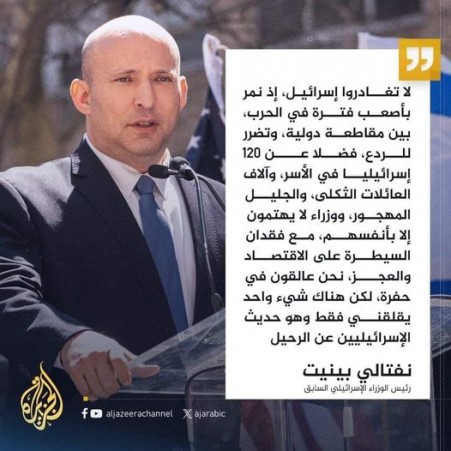 د خبیث قوم پخوانی رئیس الوزراء نفتالي بینېټ وايي: "موږ د خپل تاریخ له خورا نازک او ستونزمن پړاؤ څخه تېریږو؛ موږ له کورنیو بریدونو سره مخ یو او په نړئــواله کچه پرېکون راسره اعلان سوی؛ ۱۲۰-تنه مو لا هم یرغمال ساتل سویدي؛ په زرگونو کورنۍ غمجني دي؛ د جلیل سیمه د بریدونو له امله خالي سوېده. وزیران د خپل ژوند غم کوي؛ هیڅوک (مسؤلین) د اقتصاد په اړه اندېښنه نه ښيي؛ موږ په یوه ژور جال کي راگیـر یو. اما پر دغو ټولو شیانو سربېره چي ما کوم شی ډېر ځوروي؛ هغه له هېـواد څخه د یخرودانو د تېښتي خبرونه دي. (الجزیره)