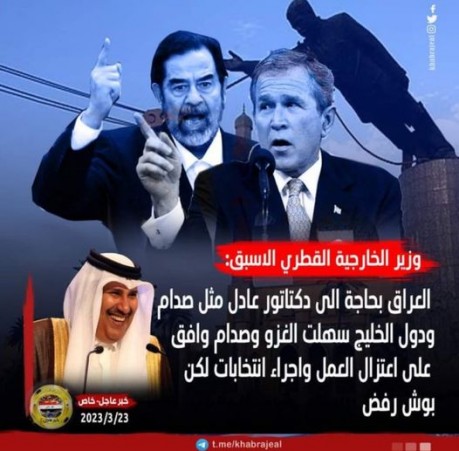 "د خلیج هېوادونو په ۲۰۰۳م کي پر عراق د امریکا یرغل ته لاره هواره کړه؛ په داسي حال کي چي صدام حسین موافقه وکړه چي استعفٰی به ورکړي او ټاکني به ترسره کوي؛ مگر بوش انـــکار او پر جگړه ئې ټینګار وکړ."